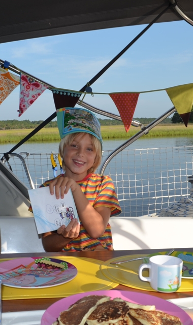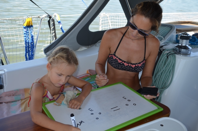 We ankeren in mooie creeks, bezoeken een vuurtoren, gaan pootjebaden en varen met ons cariebje op de kleine rivieren. Ik vind het heerlijk om tijdens het varen sMiles wat op te ruimen, af te wassen, brood te bakken, te zonnen zonder me schrap te zetten terwijl Aren en Nina buiten zitten met hun schoolboeken. Aren is door z’n schooljaar heen en het herhalen kan beginnen. Nina is zich al een tijdje aan het blindstaren op Aren z’n rekenschrift. Ze moet en zal (herkenbaar) leren rekenen. Gebogen over de rekensom (45+33=) volgt haar frustratie. Ik probeer met handen en voeten uit te leggen dat we zoiets stap voor stap moeten opbouwen. Ik haal een schrift boven van het eerste leerjaar en begin rustig, is groter dan, kleiner dan, evenveel…Ze is enthousiast en vooral kei fier met haar schrift. Al moet ik haar soms wat temperen als ze steeds doorbladert naar de grote rekensommen. Die plussen en minnen toch! 🙂